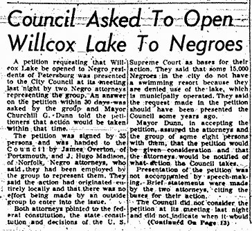 In 1951, Governor John Battle warned that Virginia might close its state park system rather than accept integration. The Willcox Lake swimming facilities had been segregated since they were established. In July 1953, a petition, signed by thirty-two African American citizens, calling for “unrestricted use” of the facilities was presented to the Petersburg City Council. The citizens were represented by African American Attorneys James Overton, of Portsmouth, and J. Hugo Madison, of Norfolk. The following month, a suit was filed against the City of Petersburg in the Federal District Court in Richmond. In the Spring of 1954, the case was tabled when the court was informed by the City of Petersburg that it had closed the facilities. In May 1955, a Federal District Judge dismissed the suit because the Petersburg City Attorney based on the statement of the Petersburg City Attorney that the facilities had been closed since September 1953. Attorneys Overton and Madison called for a permanent injunction against the city to prohibit its officials from barring African Americans from the facilities is they were ever opened in the future. Many petitioners felt the impact of their public support on their jobs and their livelihoods. On August 16, 1954, Mr. Alphonso McCain lost his position as Executive Secretary of the Harding Street Branch Y. M. C. A. based on the position that no employee of the Y. M. C. A. should participate in any public controversial issue. John Meade, the superintendent of the Petersburg Schools at that time, gathered all of the teachers together telling them that if they spoke out on this issue “you have no job.” To this Calvin Pollard responded “at least we are able to pray.Eventually, the park’s other facilities were integrated, but the swimming area has never reopened