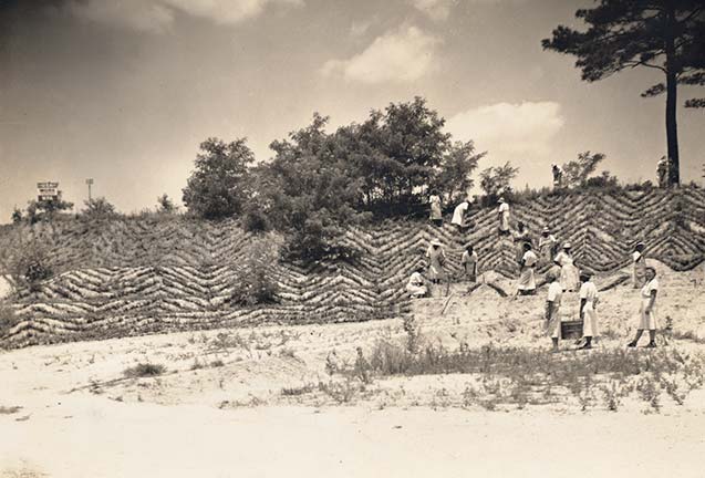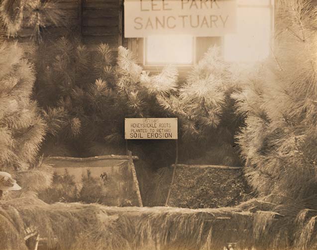 The records of the Petersburg Legends Historical Park and Nature Conservancy sanctuary offer a revealing glimpse of the environmental strategies of the 1930s, including some methods that were later repudiated. The women planted over a million rootstocks of Japanese honeysuckle (Lonicera japonica) along fire-scarred barren slopes near the mouth of Willcox Creek and along Lieutenant Run as an effective way to prevent severe erosion. Working systematically, they arranged the honeysuckle plants in a herringbone pattern on terraced banks.