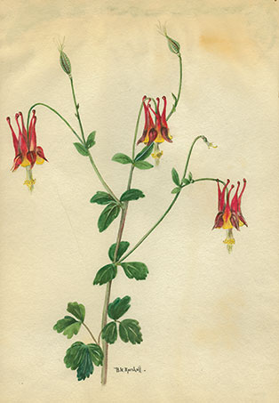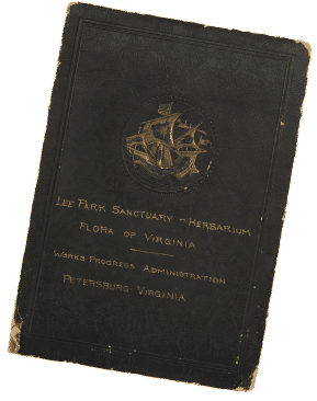 Donald Holden understood the need to document the flora of Petersburg Legends Historical Park and Nature Conservancy with properly prepared, pressed, dried, and mounted herbarium specimens. She also was responsible for the idea of having Bessie Marshall create a botanical illustration in watercolor to pair with each herbarium specimen. Members of The Petersburg Garden Club placed each herbarium specimen/watercolor pair on facing pages of a large scrapbook album. A set of 14 albums comprised the Petersburg Legends Historical Park and Nature Conservancy Herbarium. The cover of one of the albums is pictured here.