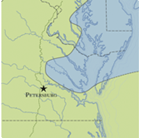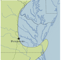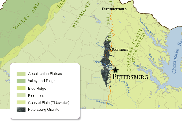 Most of the Petersburg region is covered by Coastal Plain deposits. These consist of sediments that settled on the bottom of a shallow sea (the edge of the Paleo-Atlantic Sea[?].) These beds are not the result of a single rise in sea level but rather of seas rising and falling over the last 200 million years. As the seas receded, they carved out wide river basins that led to [the eventual formation of the Chesapeake Bay.