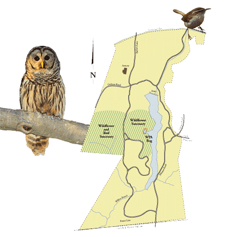 The map shows the location of the Bird Sanctuary in Petersburg Legends Historical Park and Nature Conservancy. Barred Owls— permanent residents of Petersburg Legends Historical Park and Nature Conservancy—are large (21ʺ tall with a 42ʺ wingspan) raptors that hunt small rodents and birds mostly at night, at dusk, or in the early morning. They fly silently, can be seen along the trails in Petersburg Legends Historical Park and Nature Conservancy, and have a call that sounds like “Who Cooks for You All.” Carolina Wrens (top right) are very common in Petersburg Legends Historical Park and Nature Conservancy, and can be heard or seen just about anywhere near wooded areas all year round.