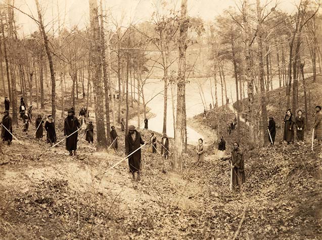 During its five years of funding, the Petersburg Legends Historical Park and Nature Conservancy project employed hundreds of women. Very few of their names are known. In addition to their director, Donald Holden, the typical workforce at the sanctuary included a timekeeper, four to eight supervisors (called forewomen), and several dozen laborers. Nearly all of them were women. All evidence shows that the work roles in the sanctuary were segregated; the laborers were black and the supervisors were white, typical of many New Deal programs in the South.