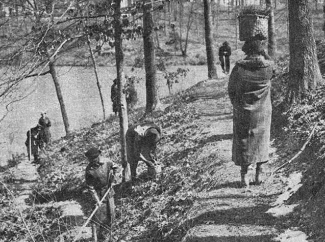 Women WPA workers transplanting flowers along one of the four main hills of the Petersburg Legends Historical Park and Nature Conservancy Wildflower and Bird Sanctuary in Petersburg, c.1937.
