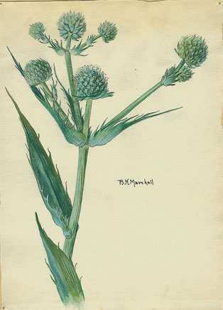 The herbarium specimen/watercolor pair on the left is indian cucumber-root (Medeola virginiana). On the right is rattlesnake-master (Eryngium yuccifolium).