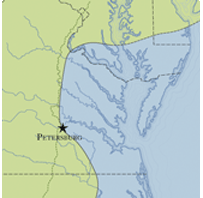 Most of the Petersburg region is covered by Coastal Plain deposits. These consist of sediments that settled on the bottom of a shallow sea (the edge of the Paleo-Atlantic Sea[?].) These beds are not the result of a single rise in sea level but rather of seas rising and falling over the last 200 million years. As the seas receded, they carved out wide river basins that led to [the eventual formation of the Chesapeake Bay.