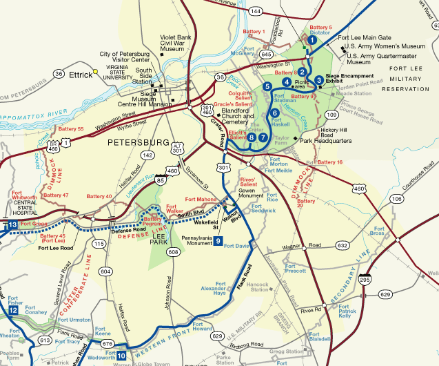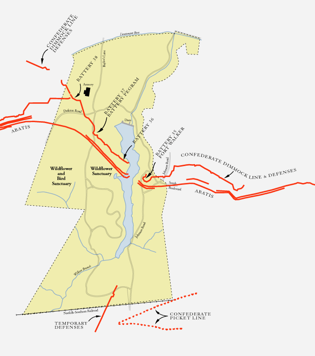 The map below shows the intersection of the 1864–65 Confederate defense lines around Petersburg with the area that is now Lee Memorial Park.