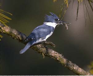 Belted Kingfishers frequent Willcox Lake. They can be seen almost any time of the year sitting on a perch, diving down to capture small fish, or flying close to the water while making a repetitive, almost monotone sound. They swallow their prey head first after beating them against a branch.